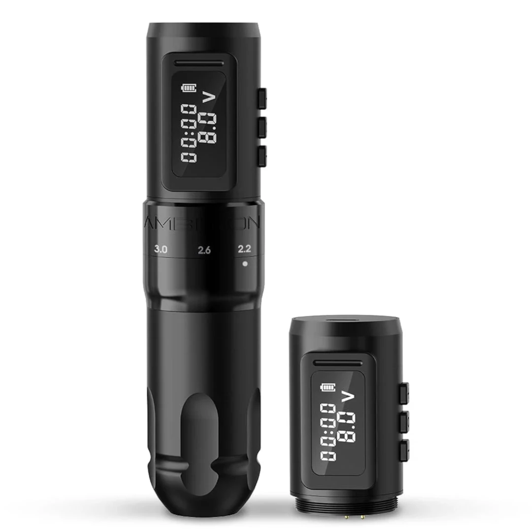 La máquina inalámbrica Ambition ofrece potencia, precisión y versatilidad gracias a sus 6 trazos ajustables y motor sin núcleo de alto rendimiento. Su batería de 1800 mAh brinda hasta 6 horas de trabajo estable. Compatible con la mayoria de cartuchos.